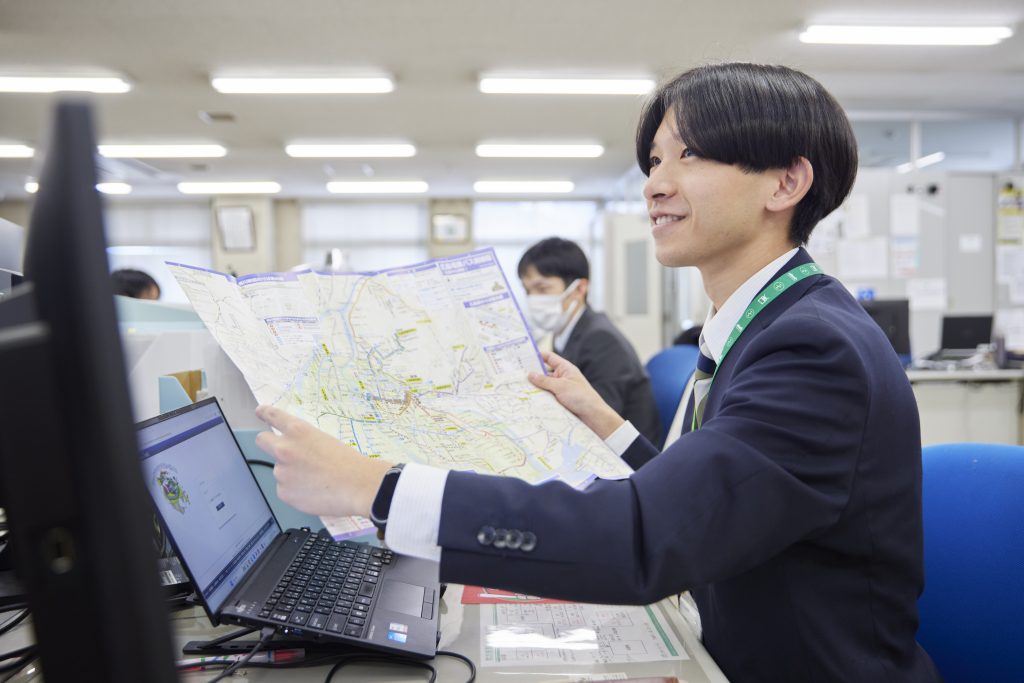 主にはバスのダイヤを引いています。お客様にとって利用しやすい公共交通を目指して、路線、時間、サービスを考えています。