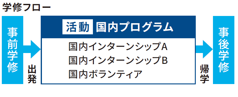 叡啓大学実践教育プラットフォーム協議会などと連携し、インターンシップやボランティア活動などに取り組むプログラムです。学生は海外で活動することを必須とし、海外プログラムと合わせて4単位以上(2科目以上)を履修します。担当教員の指導のもと、事前学修では自身が成長させたいスキルの明確化を、実習中は受入先担当者の指導を受けつつ主体的で実践的な学びを、事後学修では受入先担当者からの評価を踏まえた学びの振り返りを行い、プログラム活動の充実と学びの深化を図ります。