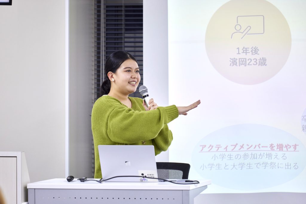 二つ目は、大学生ボランティアの増員に向けた解決策です。ここでは、バックキャスティング法を用いて、1年後から50年後までのプログラムの理想像と参加する学生の未来像を描きました。「のぼりっこ」でのボランティアに参加することで、学生自身がどのような将来像を描けるかを伝えることで、長期的に関わってくれる仲間を増やしていきたいと考えています。