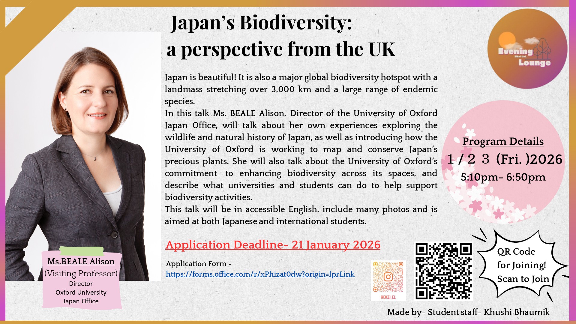 On Fri., Jan. 23, we will be hosting an evening lounge on the theme of ” Japan’s Biodiversity: a perspective from the UK ” with Ms. BEALE Alison, Director, University of Oxford Japan Office. This will be a rare opportunity to hear directly from Ms. BEALE, so we encourage all students to attend!