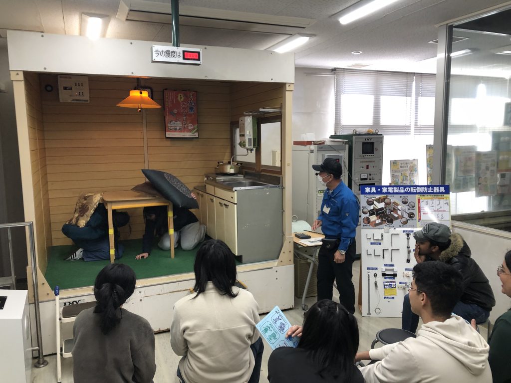 On the day of the training, nine international students took part in practical programs, including experiencing simulated earthquake shaking, practicing evacuation in a smoke-filled room, and learning how to use a fire extinguisher. Through these hands-on activities based on real disaster scenarios, participants gained a deeper understanding of disaster preparedness and the importance of appropriate actions.
