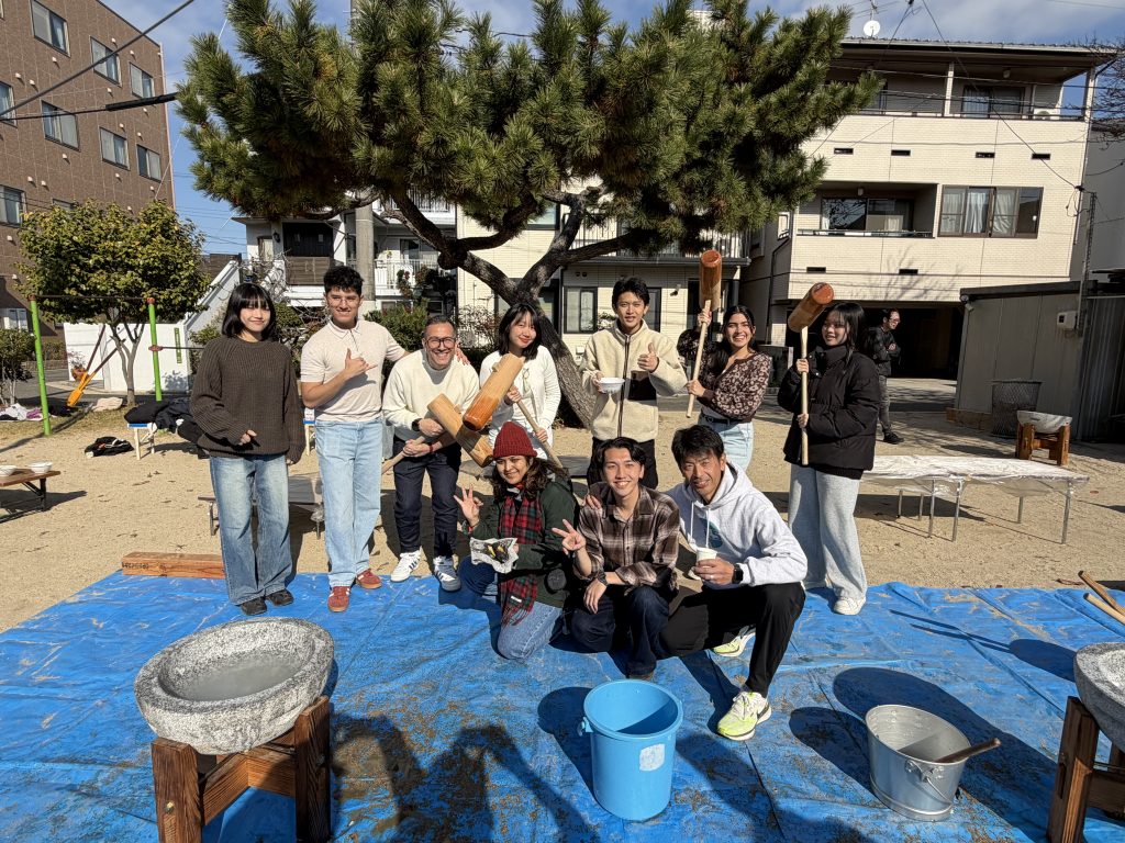 2025年12月6日(土)、本学の留学生6名が、広島市中区吉島新町地区町内会の皆さまと餅つきイベントに参加しました。