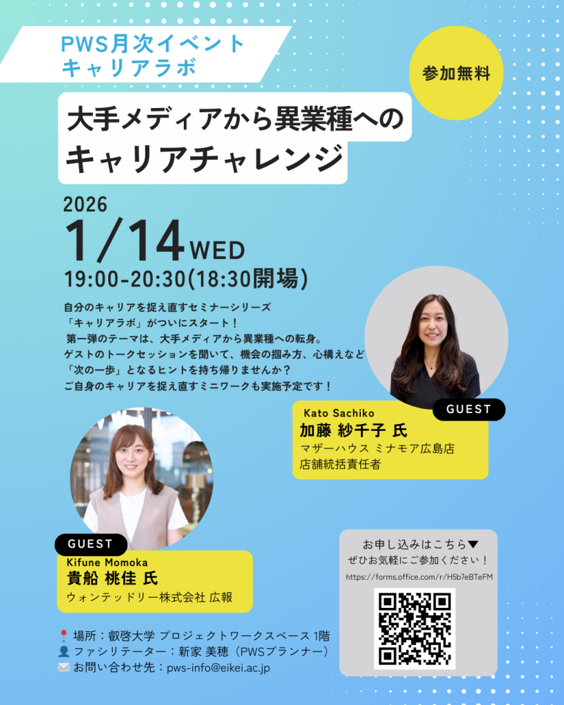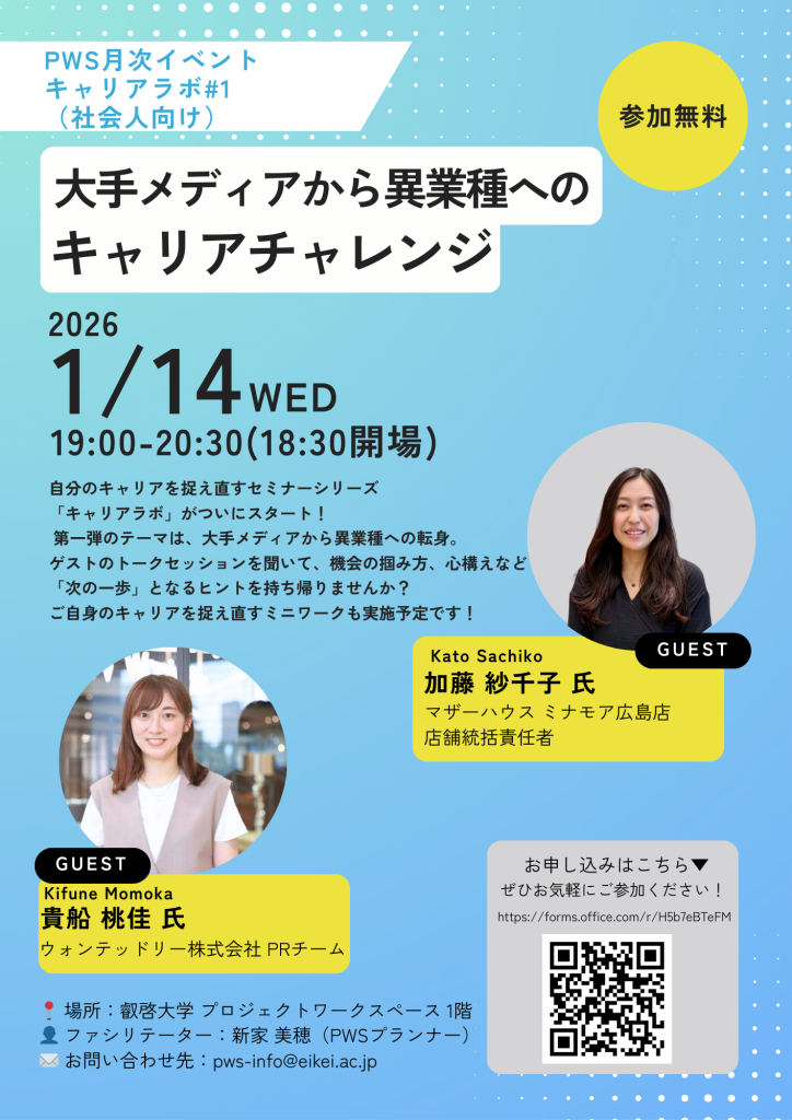 2025年1月14日(水)、叡啓大学のプロジェクトワークスペースにて、PWS月次イベント: キャリアラボ~大手メディア企業から異業種へのキャリアチェンジ~を開催します。
