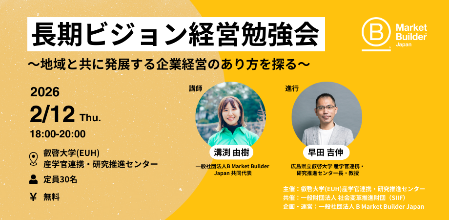 こうした中、「B Corp」という国際認証が、俄かに注目を集め始めています。本イベントでは、国内外のトレンドや事例の紹介と、自社の価値を整理・共有するワークショップを通じて、地域企業がすでに持つ価値をあらためて捉え直し、売上や利益の最大化にとどまらず、自然環境や地域社会との調和を通じて、企業価値の持続的向上を目指す経営のあり方を探ります。