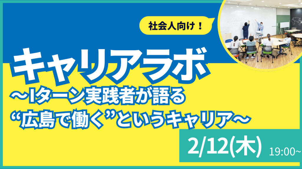 2月12日(木)、叡啓大学のプロジェクトワークスペースにて、PWS月次イベント:社会人キャリアラボ#3〜Iターン実践者が語る“広島で働く”というキャリア〜 を開催いたします。
