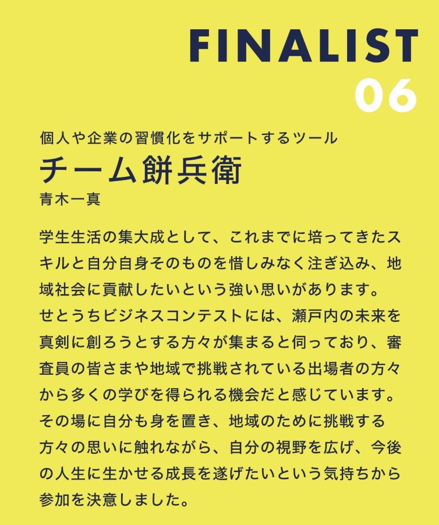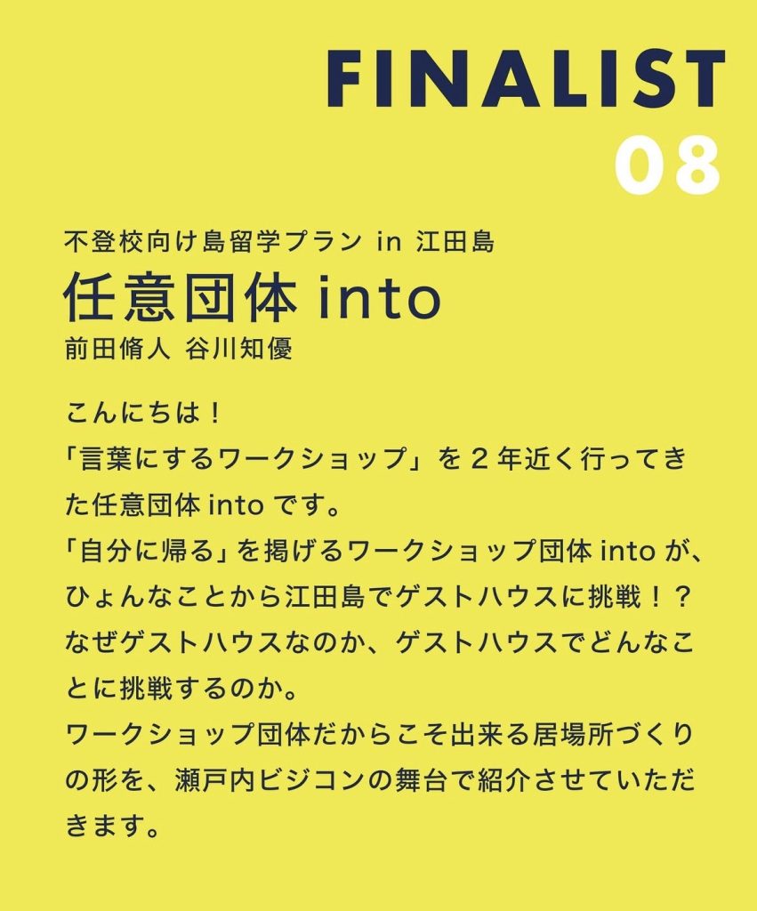 また、「2年前から憧れだったセトビジがintoがこれから本格的に瀬戸内で挑戦するにあたってセトビジで飛躍したいと考えたことです。叡啓大学で見つけた様々な気づきの結晶を発表できたらと思っております。」と意気込みを語っています。