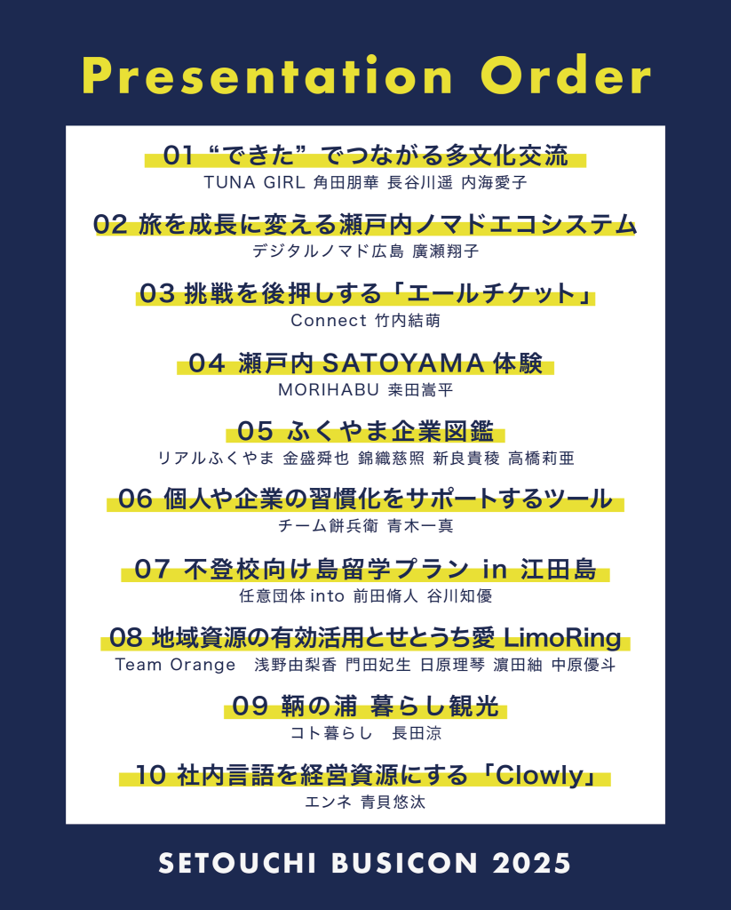 同コンテストは、瀬戸内地域の課題解決や活性化につながるビジネスプランを募集し、その実現を応援するコンテストで、全国から届いた36チームのエントリーから選ばれたファイナリスト10組として本選出場者が決まりました。