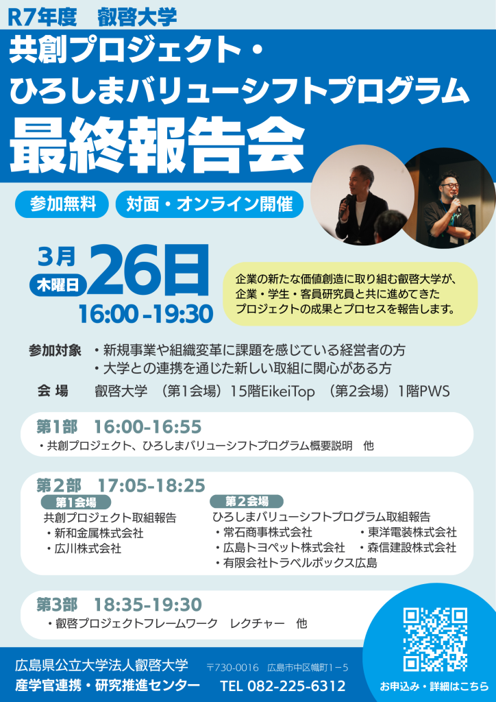 お問合わせ先TEL:082-225-6312(叡啓大学教育企画課社会連携係 石橋、福場)