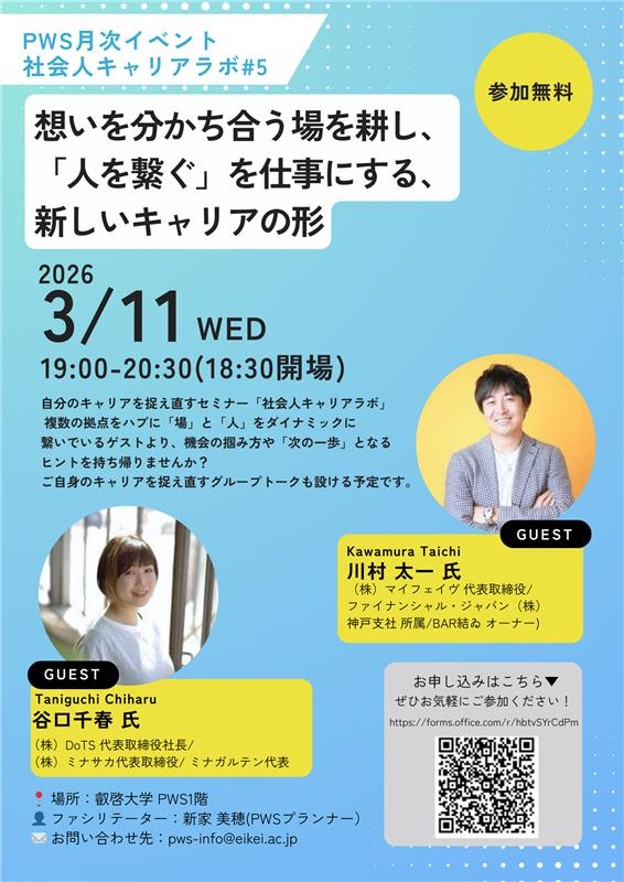 【参加者募集】3月11日(水) PWS月次イベント:社会人キャリアラボ#5〜想いを分かち合う場を耕し、「人を繋ぐ」を仕事にする、新しいキャリアの形〜