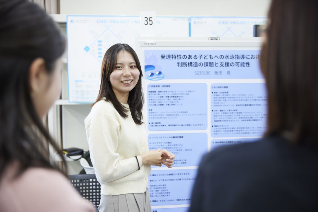 スイミングスクールでのアルバイトを通して、集団行動が難しい子どもや発達障がい・グレーゾーンの子どもへの対応が日常的に発生している現状に違和感を抱きました。命に関わる場面で、療育等の専門知識を持たない指導者個人が判断を背負うには限界があります。そこで、指導者の意思決定を支える思考補助ツール「そっとスイム」を開発しました。発達特性のある子どもの行動や不安をデータベース化し、AIが適切な声かけや関わり方を提示する仕組みです。実際にアルバイト先で活用し、プロジェクトの一番の目的であった私自身の指導上の悩みを解消することができました。また、調査を進める中で、児童福祉や療育の分野では国・社会・企業・現場のいずれも課題を抱え、判断を支える仕組みが不足していることを知りました。卒業プロジェクトは、福祉・療育業界の構造的課題を可視化するとともに、私個人の日常の悩みや疑問が、社会の仕組みと地続きであると気づく機会になりました。