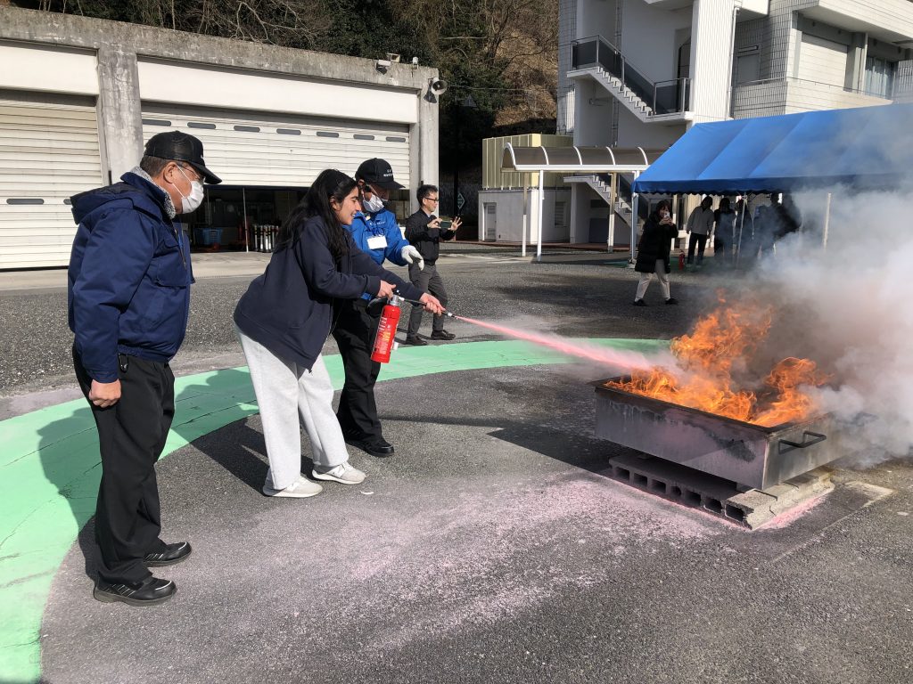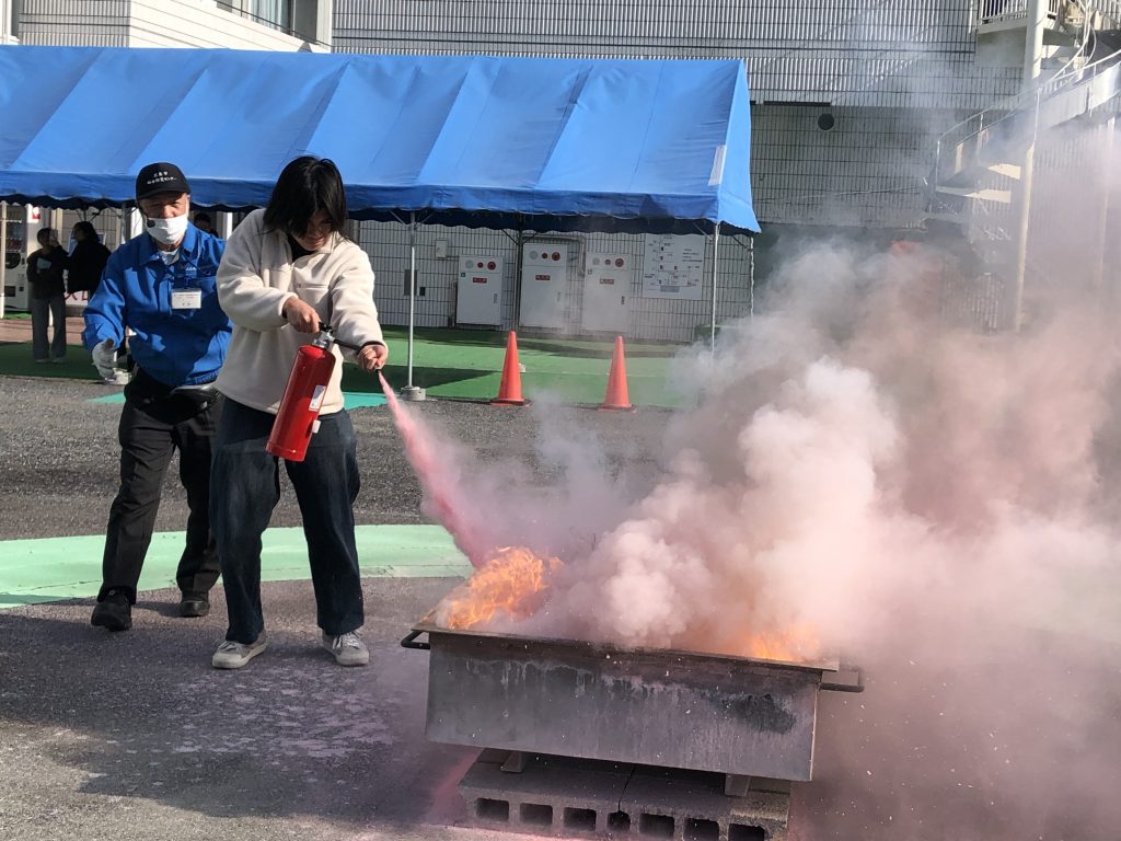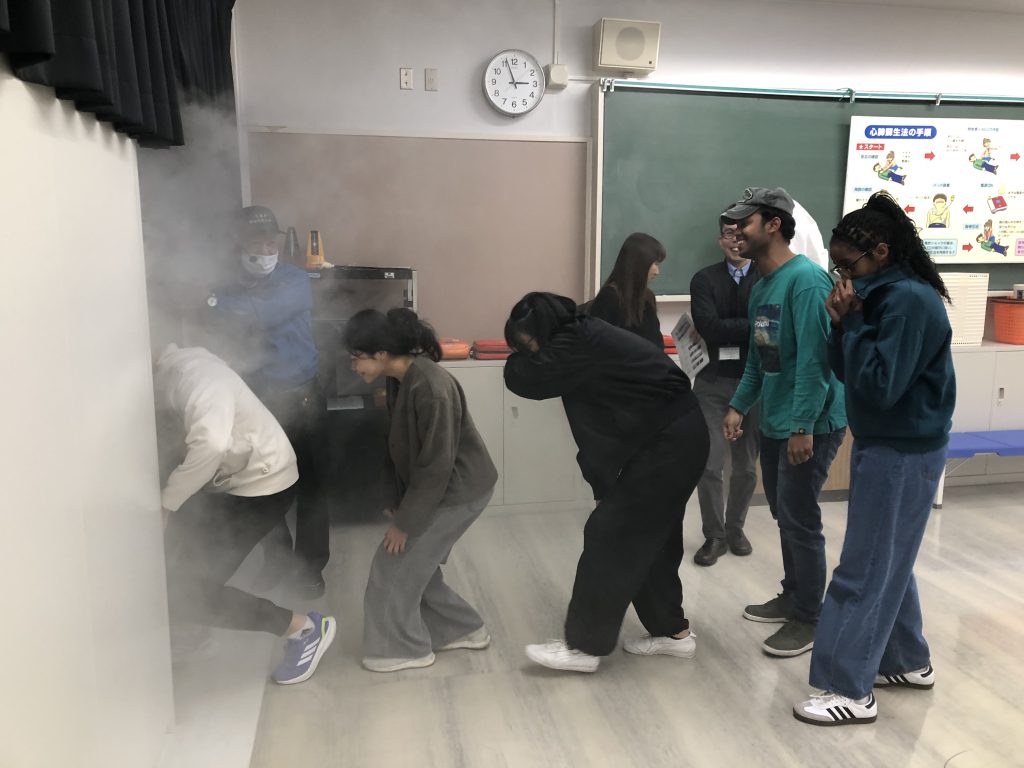 当日は留学生9名が参加し、地震の揺れを体感する訓練や、煙が充満した室内での避難体験、消火器の使用方法の実習など、実践的なプログラムに取り組みました。参加者は、実際の災害を想定した体験を通して、防災に関する知識と行動の重要性について理解を深めました。