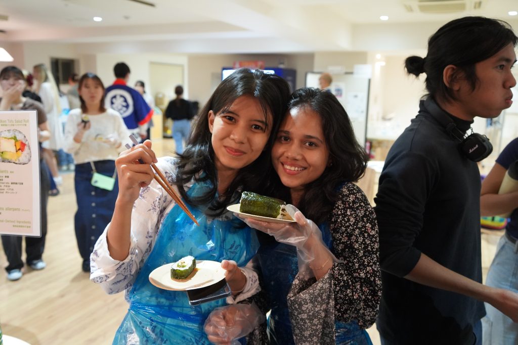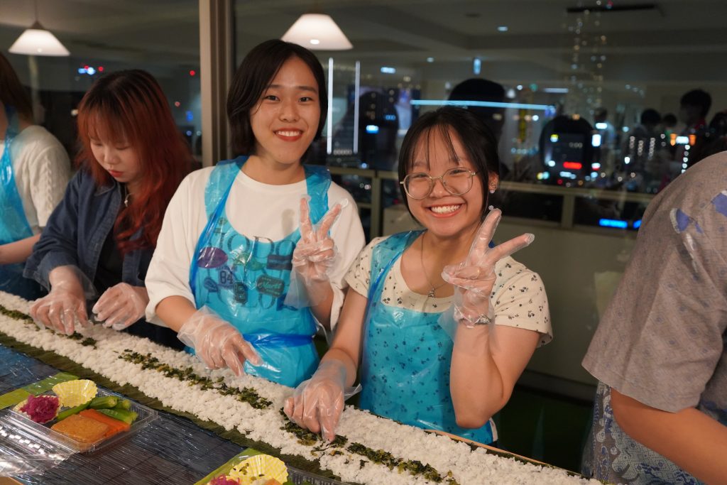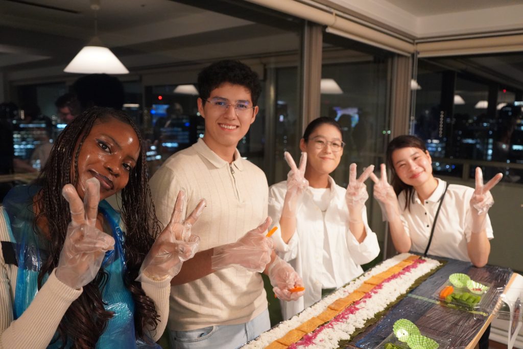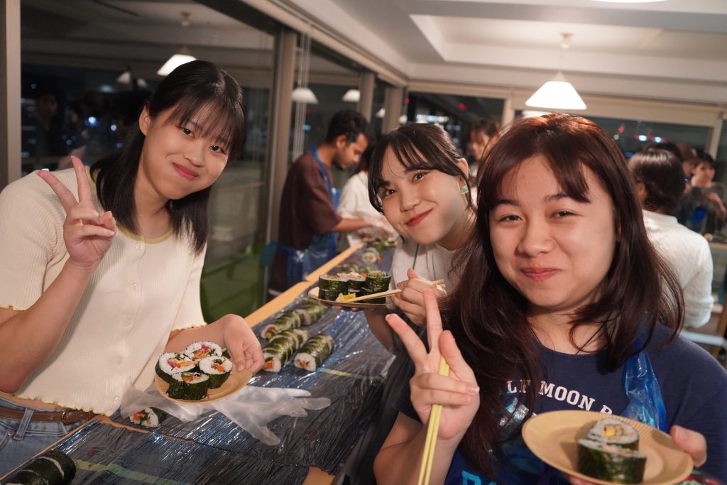 当日の目玉となったのは、全長27メートルにも及ぶ「ロング巻きずし」作りです。中に入れる具材の異なる3種の巻き寿司を、参加者全員で息を合わせて完成させました。色とりどりの具材とともに、笑顔が会場にあふれ、国籍や大学の垣根を越えた賑やかな交流の場となりました。 このようなユニークな体験を通して、参加者たちは互いの文化に触れ合いながら親睦を深めることができ、両大学間での国際交流のさらなる活性化が期待されます。