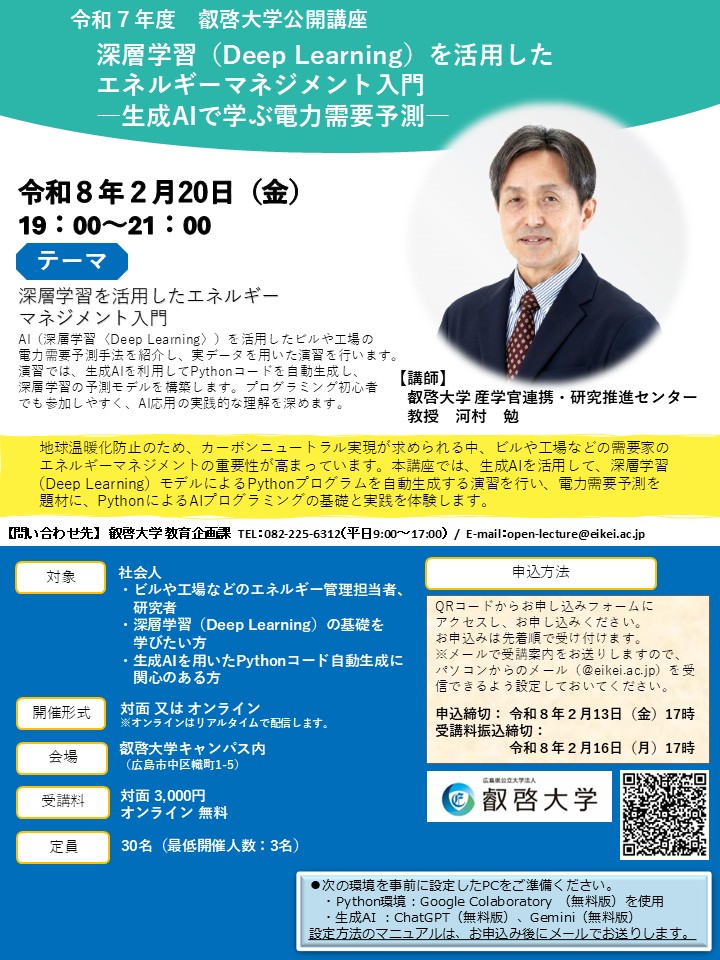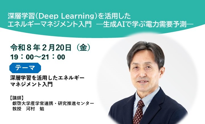 叡啓大学では、公開講座「深層学習(Deep Learning)を活用したエネルギーマネジメント入門 ―生成AIで学ぶ電力需要予測―」を開講します。