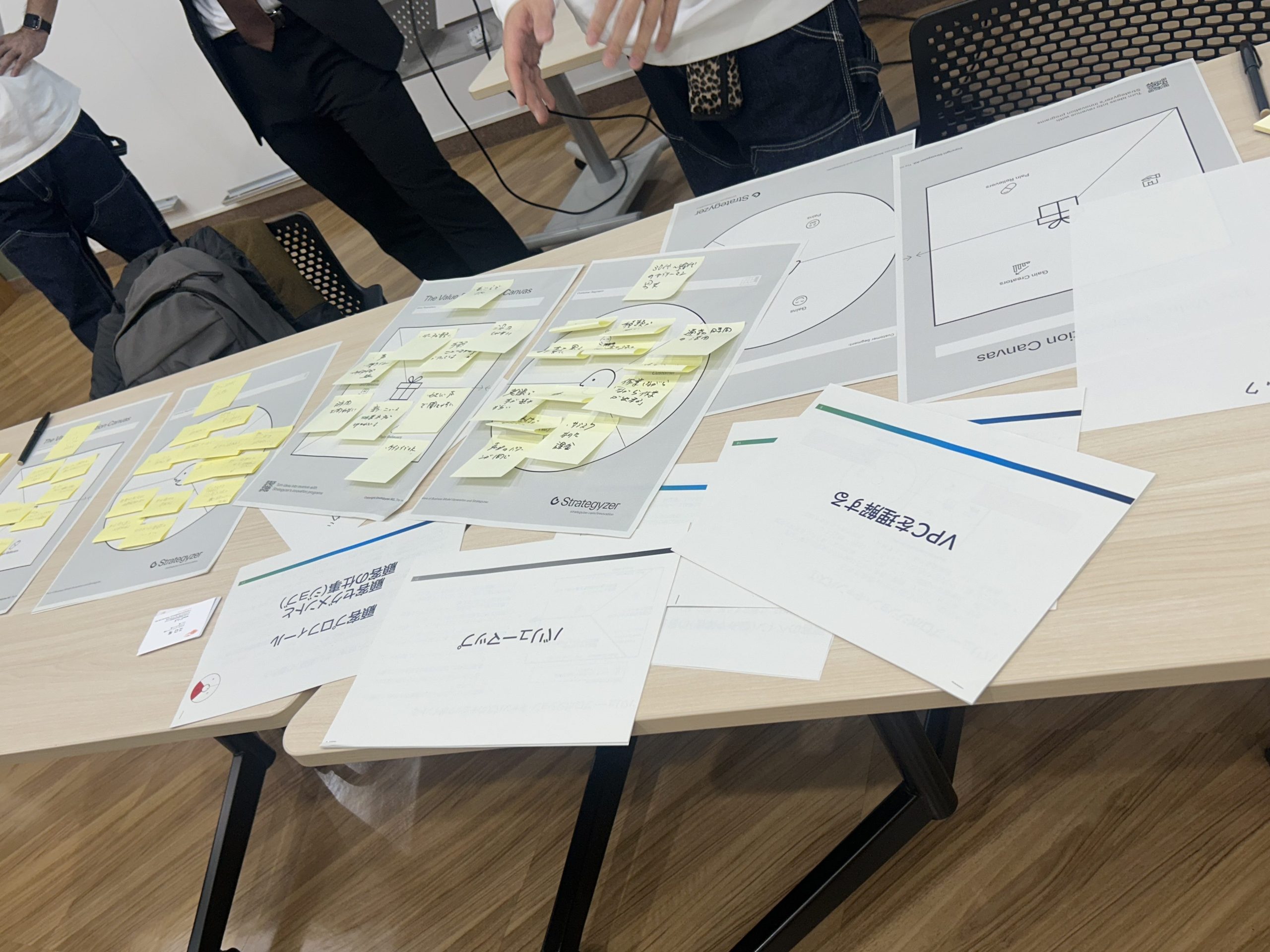 ワークはチーム形式で行われ、参加者同士が互いのバリュープロポジションキャンバスを見比べ、着眼点の違いを議論しながらブラッシュアップを進めました。書いた内容を共有し合うことで、「同じテーマでもここまで違う視点があるのか」といった気づきが多く生まれていました。
